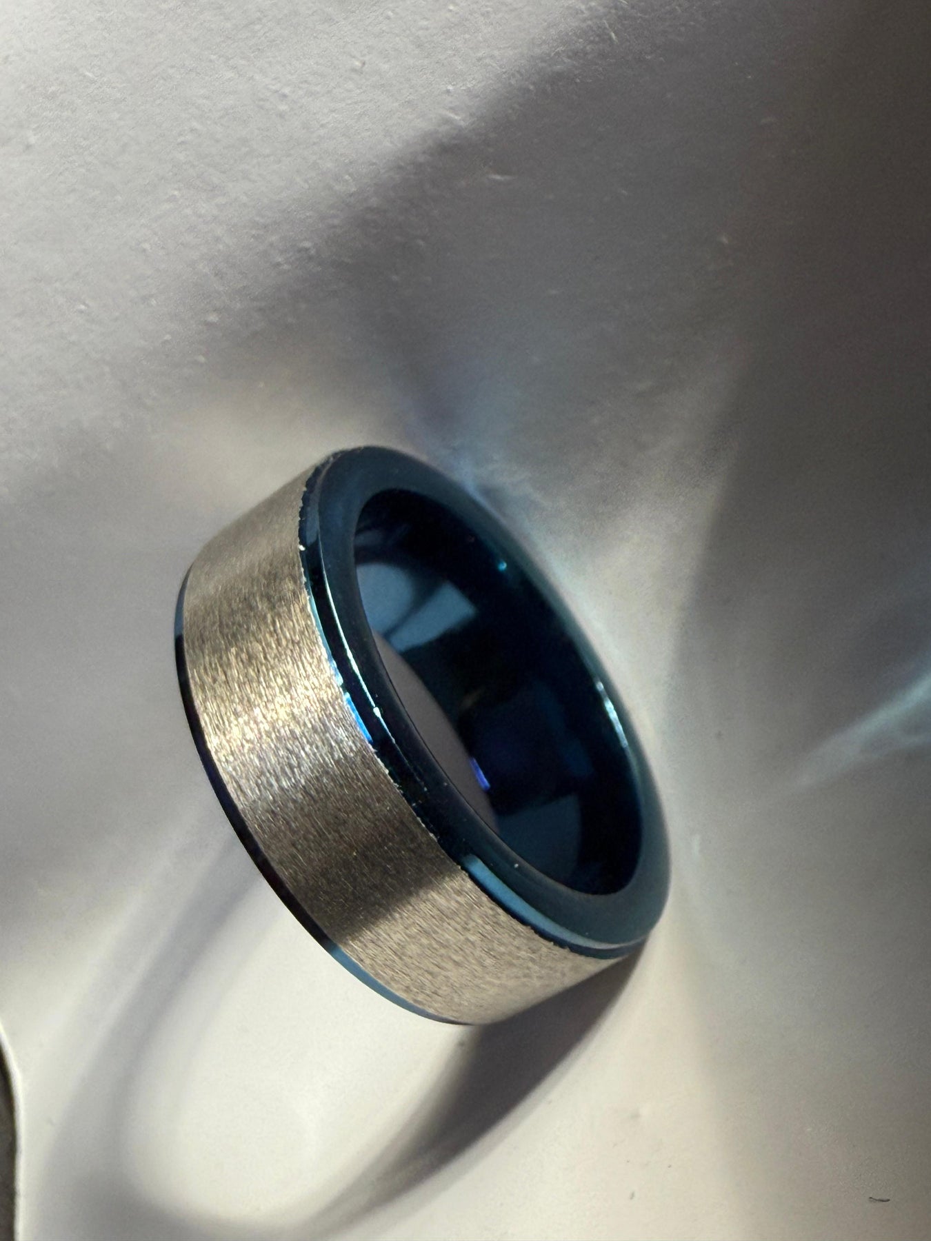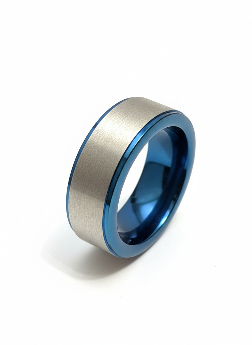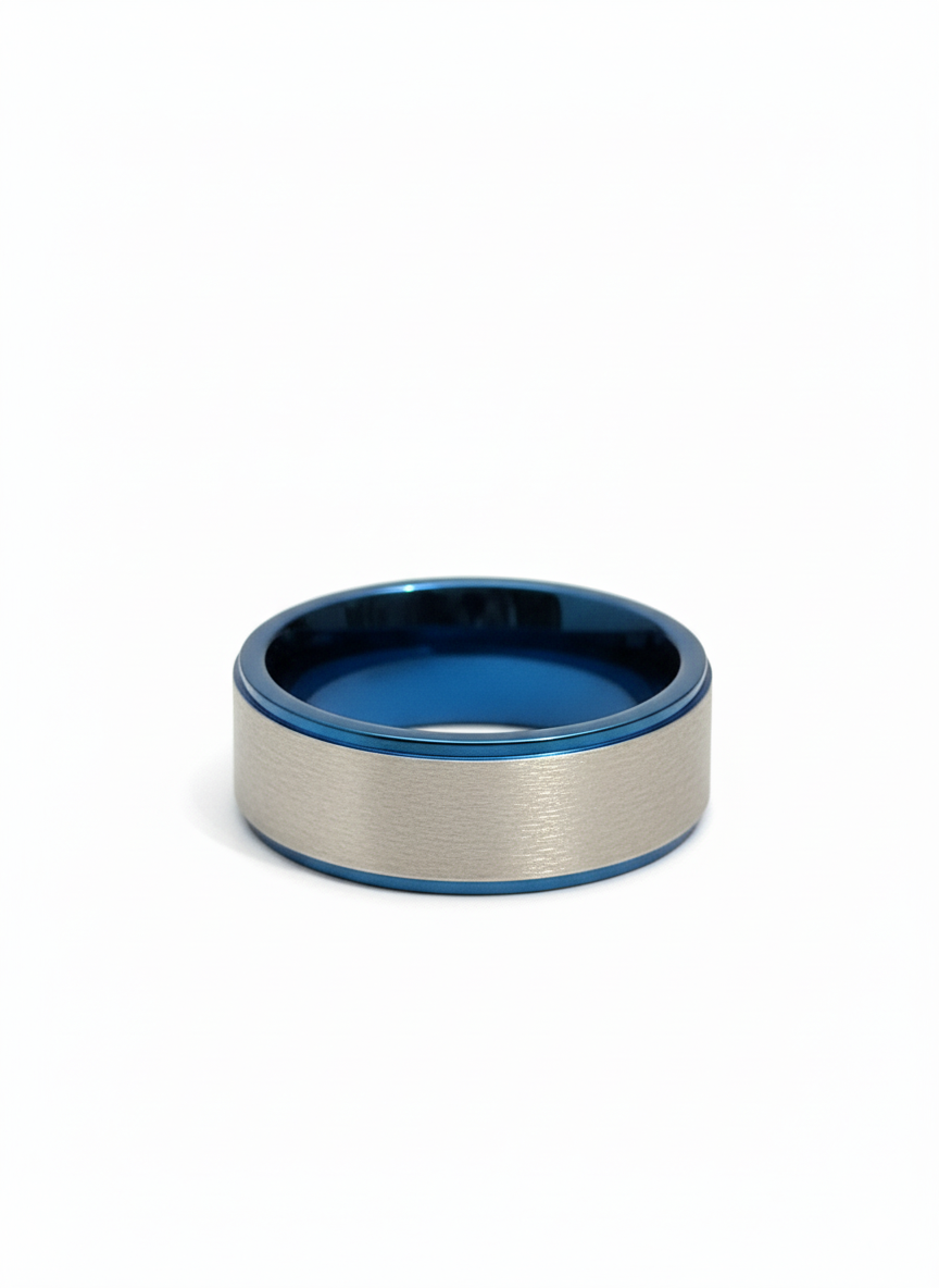 Command attention with a ring that perfectly blends bold color and sleek texture. The  features a striking, smooth electric blue inner band and edges that frame a sophisticated brushed silver center. This powerful two-tone design creates a look that is both dynamic and modern. Crafted from ultra-durable tungsten carbide (or the material you use), this ring is built to withstand an active lifestyle. The vibrant blue finish is not only visually stunning but also complements the matte texture of the silver center, ensuring this piece stands out on your hand. The comfort-fit interior means you get a perfect feel for all-day wear.Whether you're looking for a unique wedding band, a statement piece, or a durable everyday ring, the Azure Edge is the ultimate expression of confidence and contemporary style.